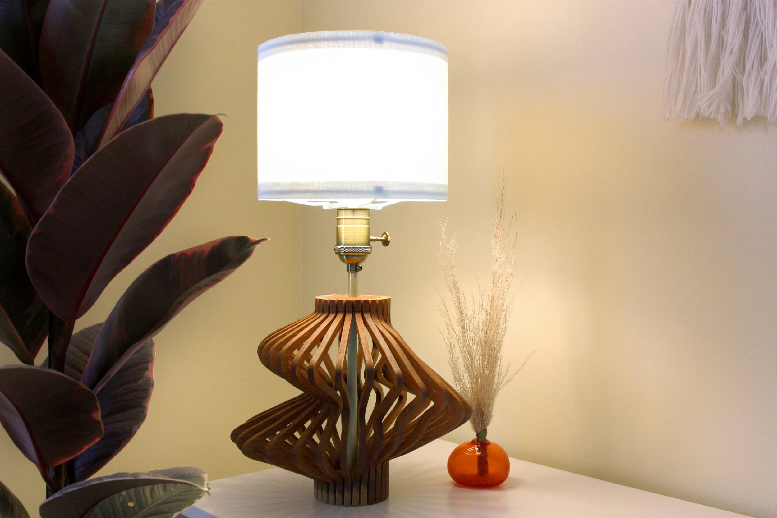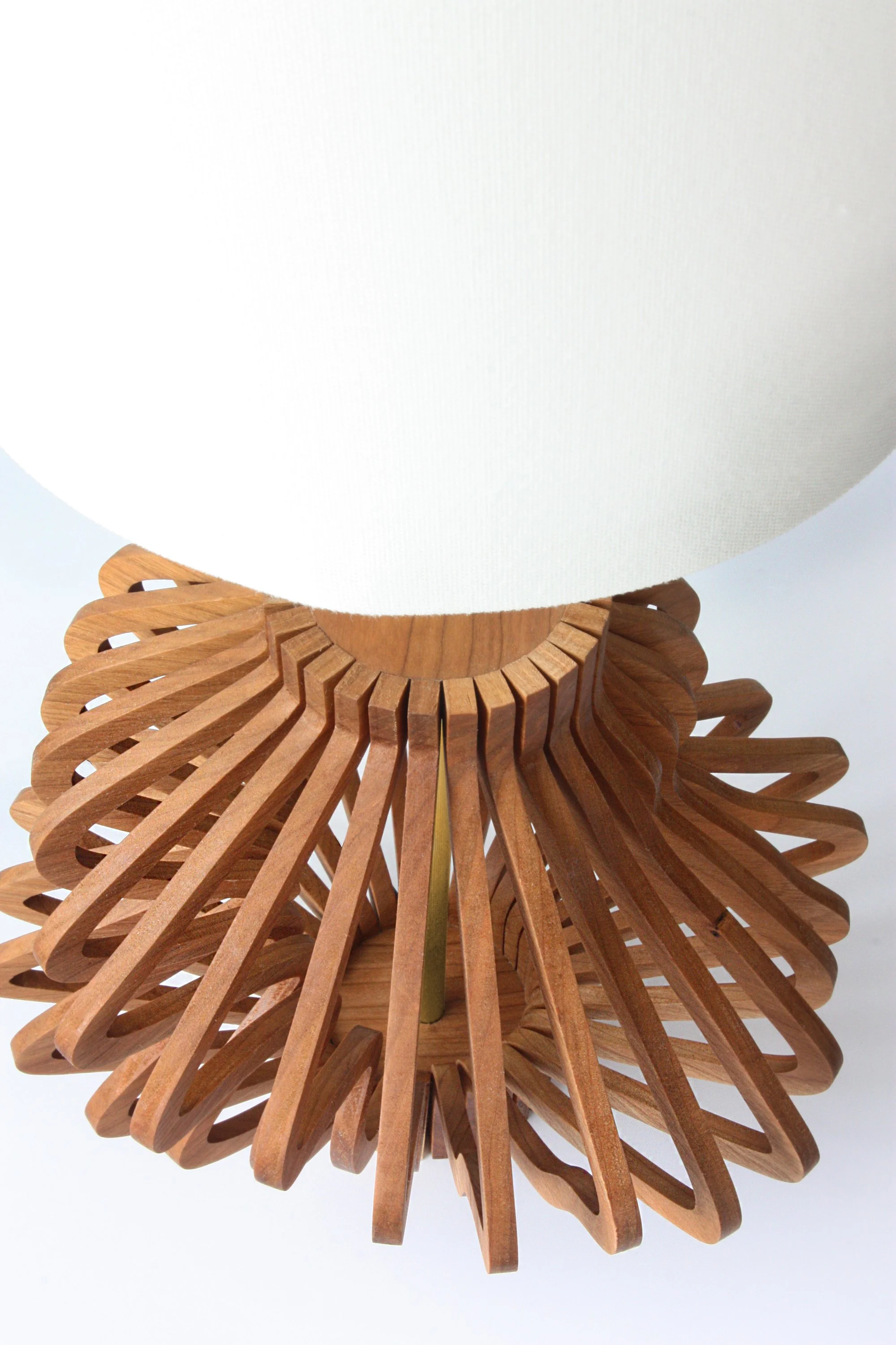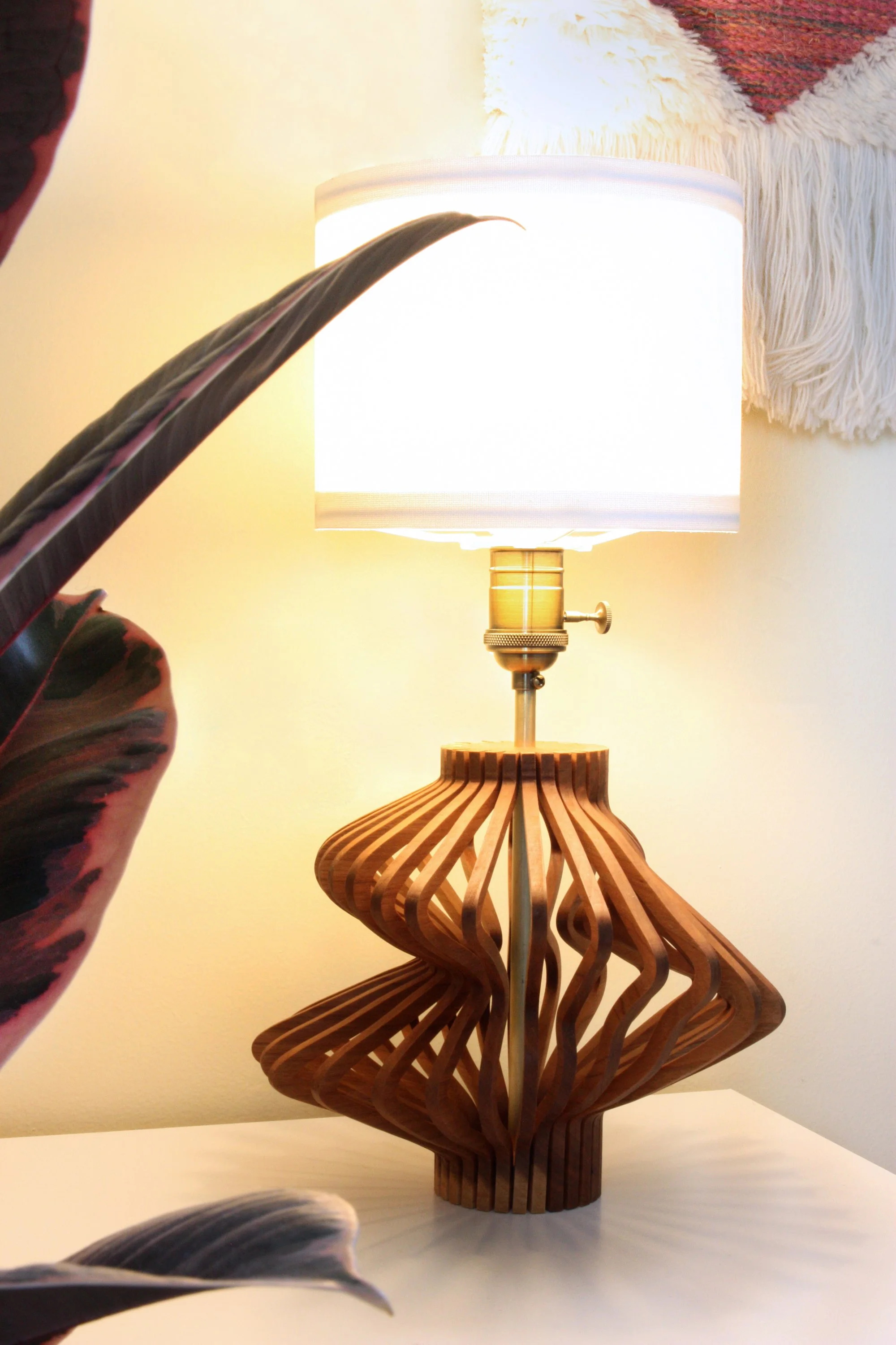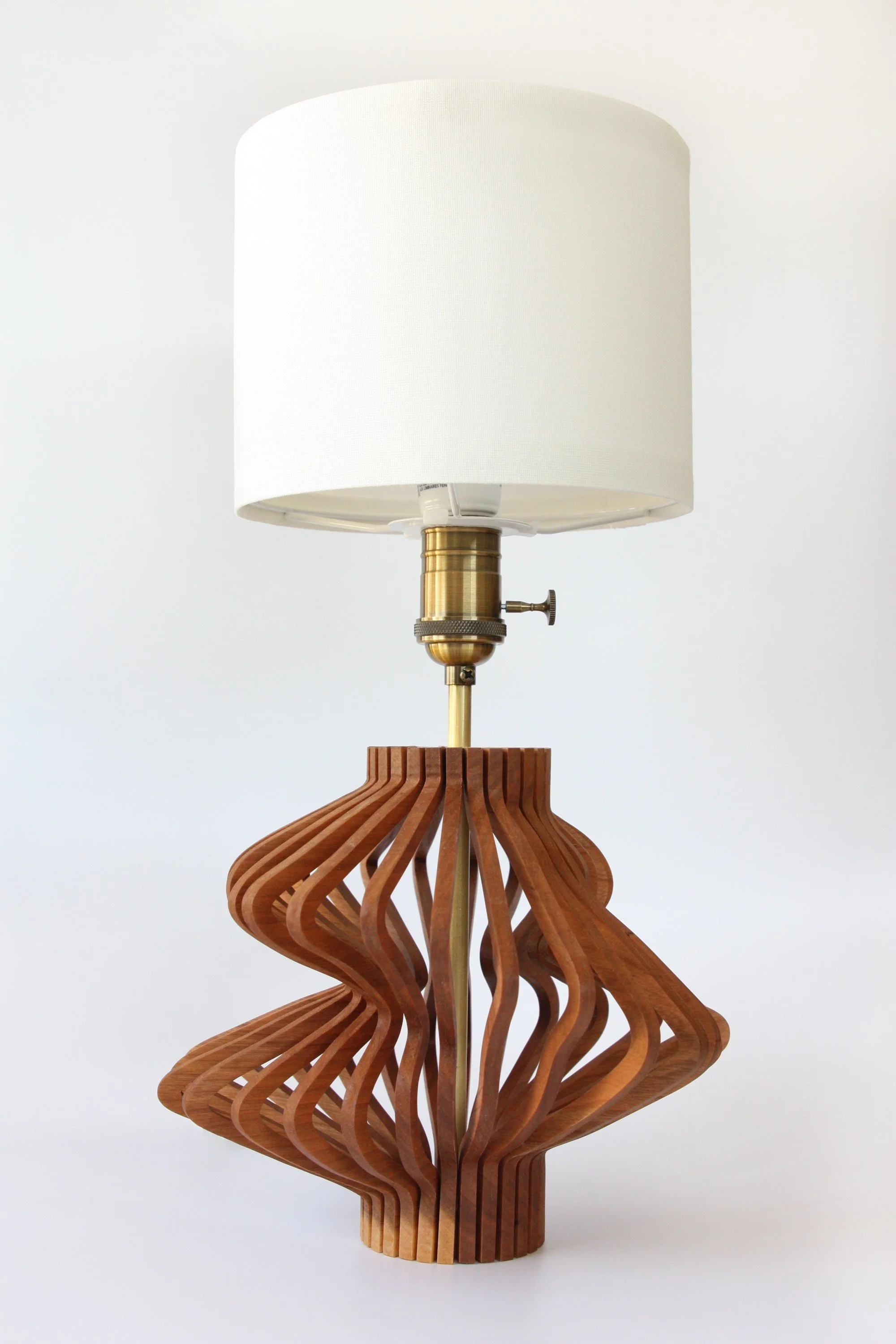 This Mid-century modern inspired lighting product is made with solid cherry and brass. It uses nature as a source of inspiration to create dominate shapes and curves to make a statement. There are no stains or dyes applied to our products. We let the natural color radiate through with Sam Maloof poly/oil wood finish. This lamp is perfect for any space. All our products are designed and fabricated in Los Angeles, California.