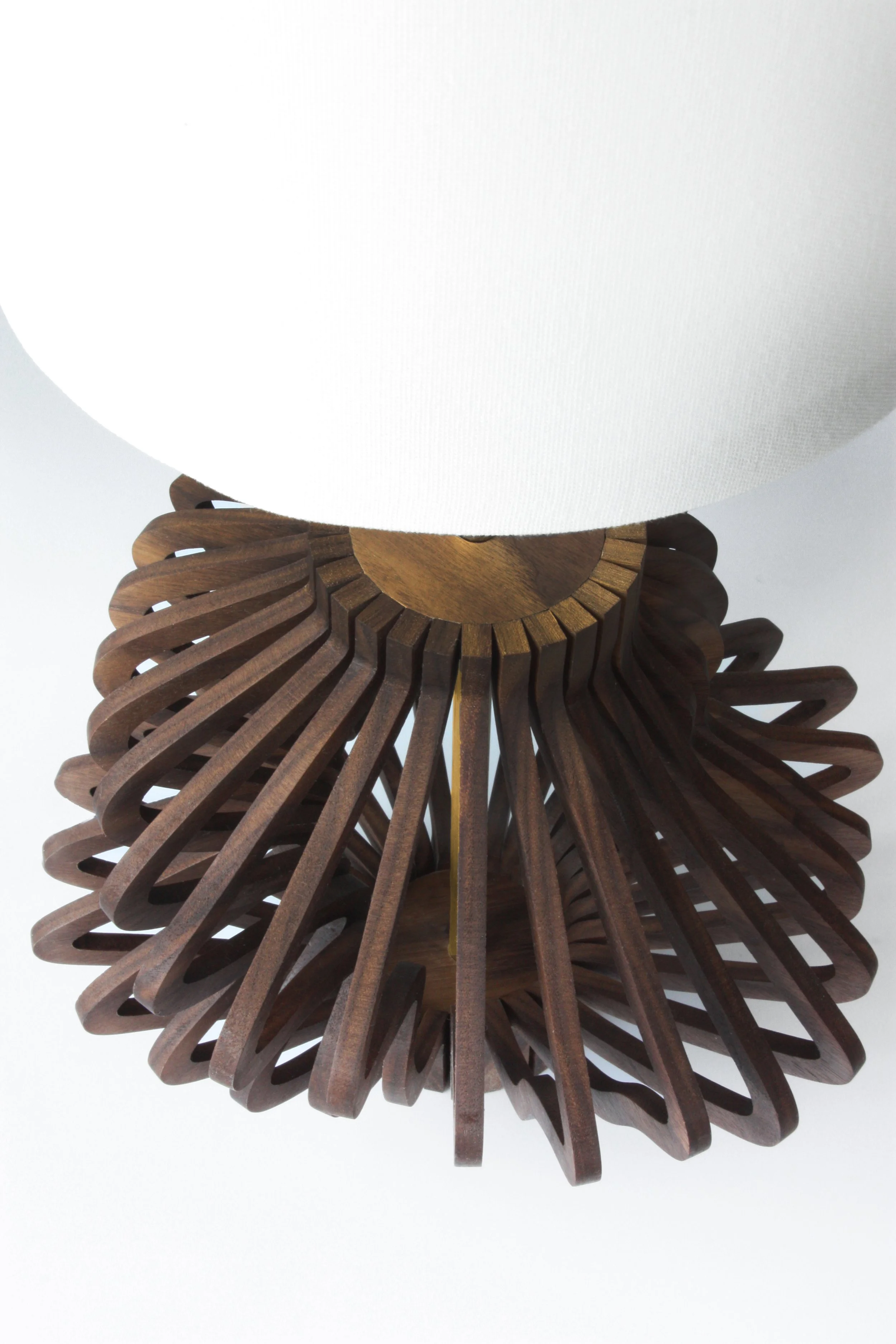 This Mid-century modern inspired lighting product is made with solid walnut and brass. It uses nature as a source of inspiration to create dominate shapes and curves to make a statement. There are no stains or dyes applied to our products. We let the natural color radiate through with Sam Maloof poly/oil wood finish. This lamp is perfect for any space. All our products are designed and fabricated in Los Angeles, California.